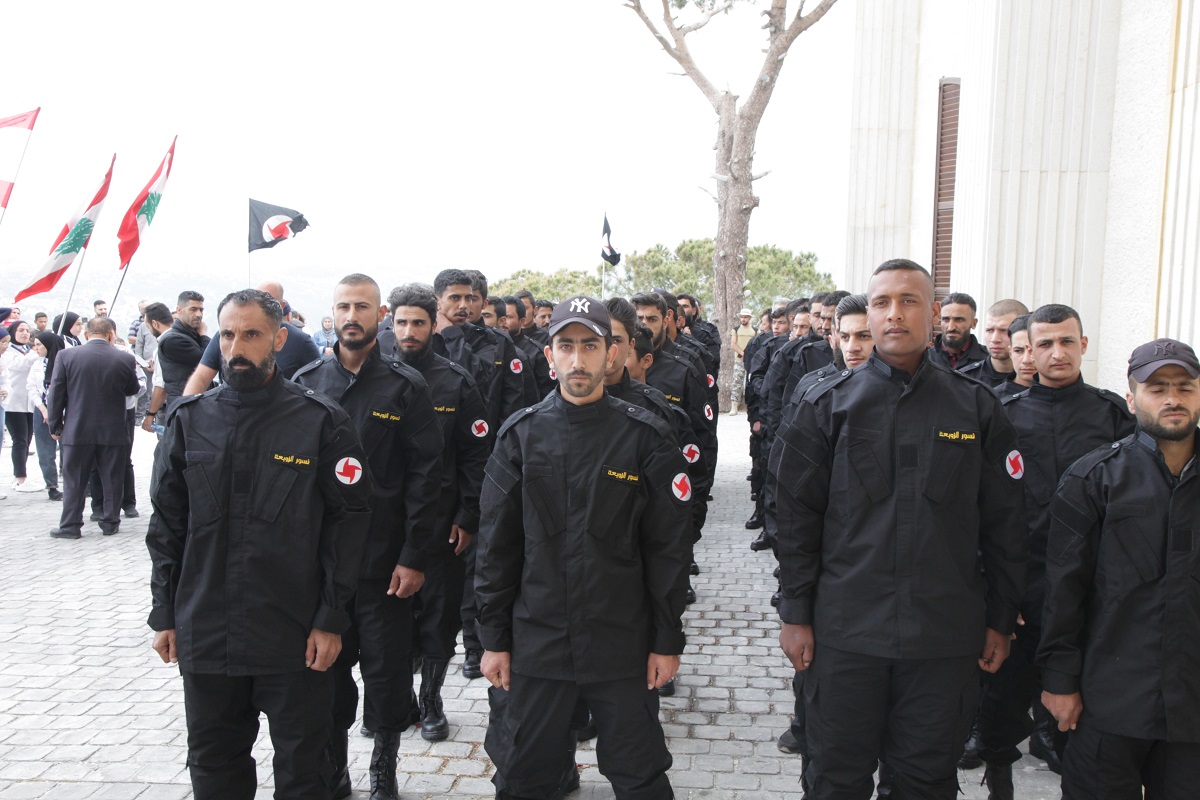 أضاف: قال مؤسس الحزب السوري القومي الاجتماعي الشهيد أنطون سعاده، إنْ كنتم ضعفاء وقيتكم بجسدي، إنْ كنتم أقوياء سرت بكم إلى النصر، لكني قبل ذلك أقصيت عني كلّ جبان، فقضية تساوي الوجود كلّه، لا تقبل فيها من يرضى الهوان. حجمها يحتاج إلى جبابرة يمارسون البطولة في كلّ آن.. يحملون لواء الحق زوبعة، يرفعونها في كلّ ميدان، ساحات الجهاد لم يبرحوها قط ومن دعاهم إليها أخطأ العنوان، نحن أبناء الحياة الأوفياء، اسأل عنا سوق الخان على بعد كوفية من هنا تدرّبوا، فاجتمع كلّ ما في الأرض من شموخ وعنفوان.. وجدي الصايغ، سناء محيدلي، مالك وهبي، ابتسام حرب، خالد أزرق، علي طالب، مريم خير الدين، محمد قناعة، نورماً أبي حسان، عمار الأعسر، زهرة أبو عساف، فدوى غانم، علي عاصي، محمد عواد، أدونيس نصر وخالد علوان… شرب التراب الأحمر القاني فتفتحت زوابعاً شقائق النعمان وقالت دماؤهم للنصر كن فكان.