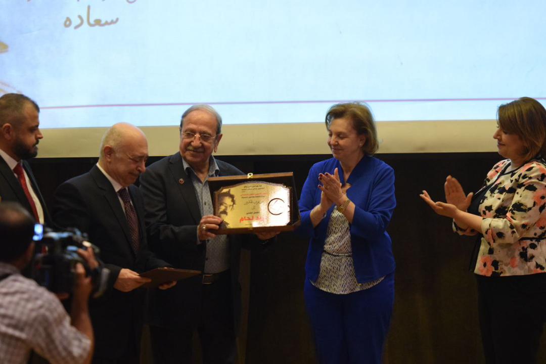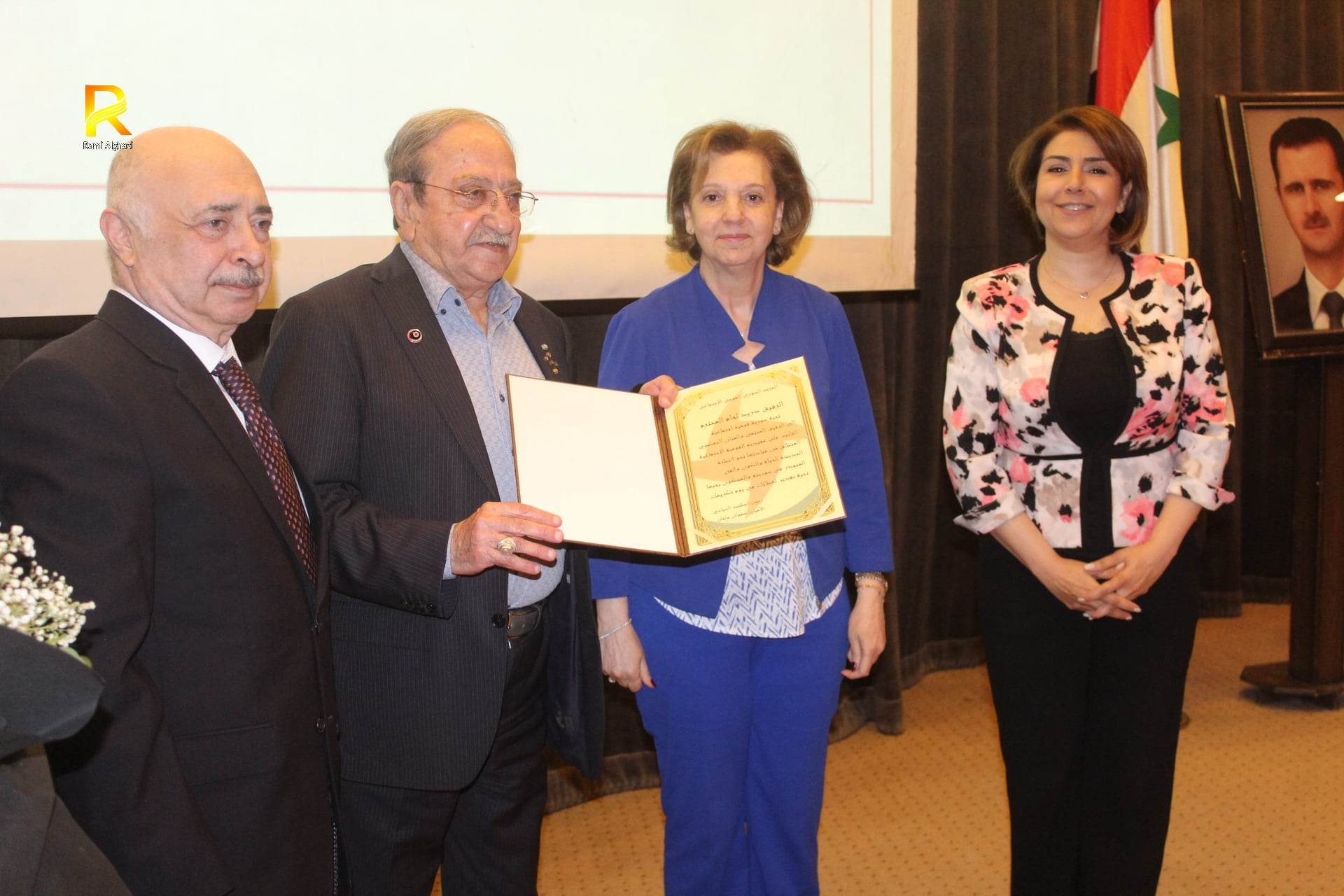 بعد الكلمات أقيمت مراسم التكريم على المسرح، وتسلم المكرّم درعاً تقديرية ورسالة تحية وباقة ورد.