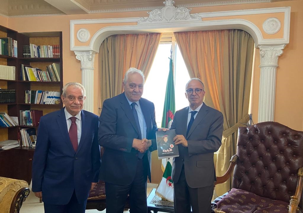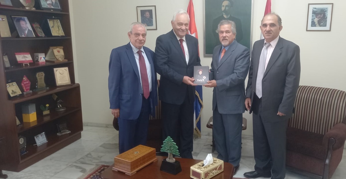 نائب رئيس الحزب الأمين وائل الحسنية وعميد القضاء ريشار رياشي وعضو المجلس الأعلى د. جورج جريج خلال تسليم مسؤول العلاقات الإعلامية في حزب الله الحاج محمد عفيف نسخة من كتاب “الأيقونة البطلة الإستشهادية سناء محيدلي” إلى سماحة أمين عام حزب الله السيد حسن نصرالله، موقعة من رئيس الحزب الأمين أسعد حردان. (22 آب 2023)